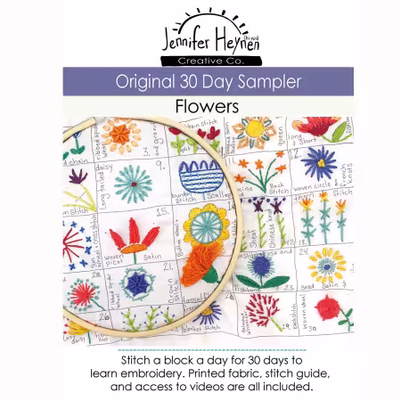 Stitch a block a day in the 30 day sampler kit. Kit includes printed fabric, access to a class blog with videos of all of the stitches as well illustrations. There is a full color stitch guide included in the kit as well. Fabric is 9" x 14" and the printed area is a 7" x 12" rectangle.